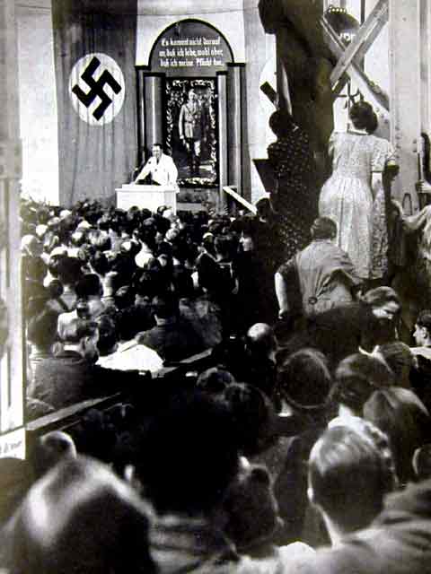ナチスの演説会に集まった人々。演壇の後ろにはヒットラーの写真がある。